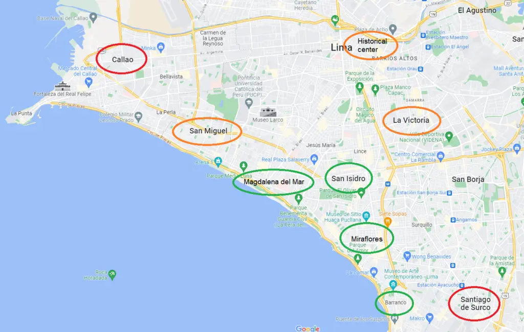A map of Lima with the safest areas in green, areas which are fine during the day, but which I would avoid alone at night in orange, and areas I recommend against visiting in red.