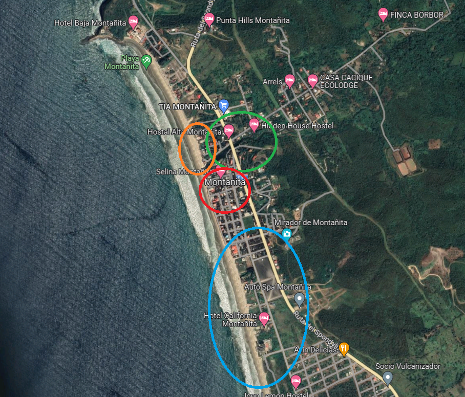 Another thing to note is that the beach is split between north beach and south beach by a river which connects to the ocean (visible at the bottom of the orange circle). The northern part is a bit more sparsely occupied, although one of my favorite restaurants which I covered in my Taste of Montanita article is located at the north end of the beach.